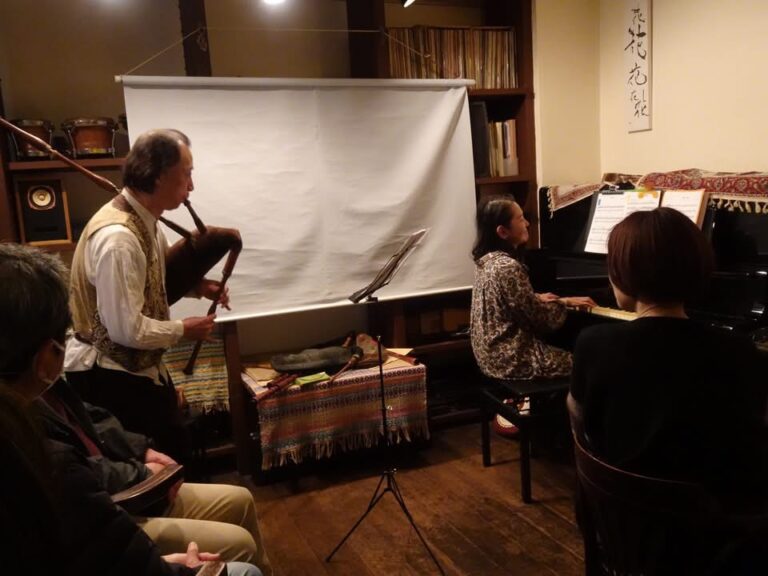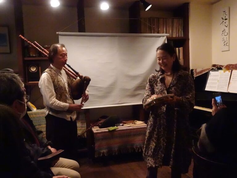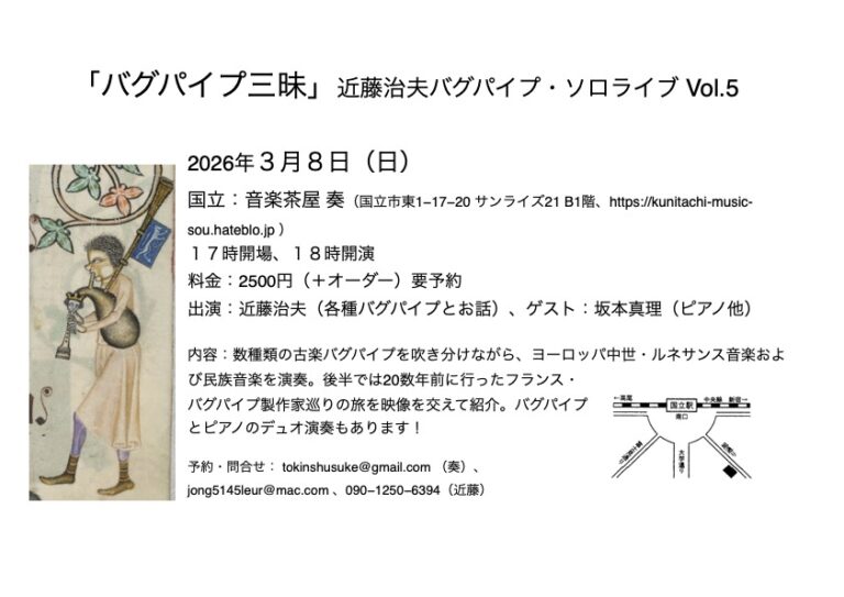 内容:数種類の古楽バグパイプを吹き分けながら、ヨーロッパ中世・ルネサンス音楽および民族音楽を演奏。後半では20年前に行ったフランス・バグパイプ製作家巡りの旅を映像を交えて紹介。バグパイプとピアノのデュオ演奏もあります!