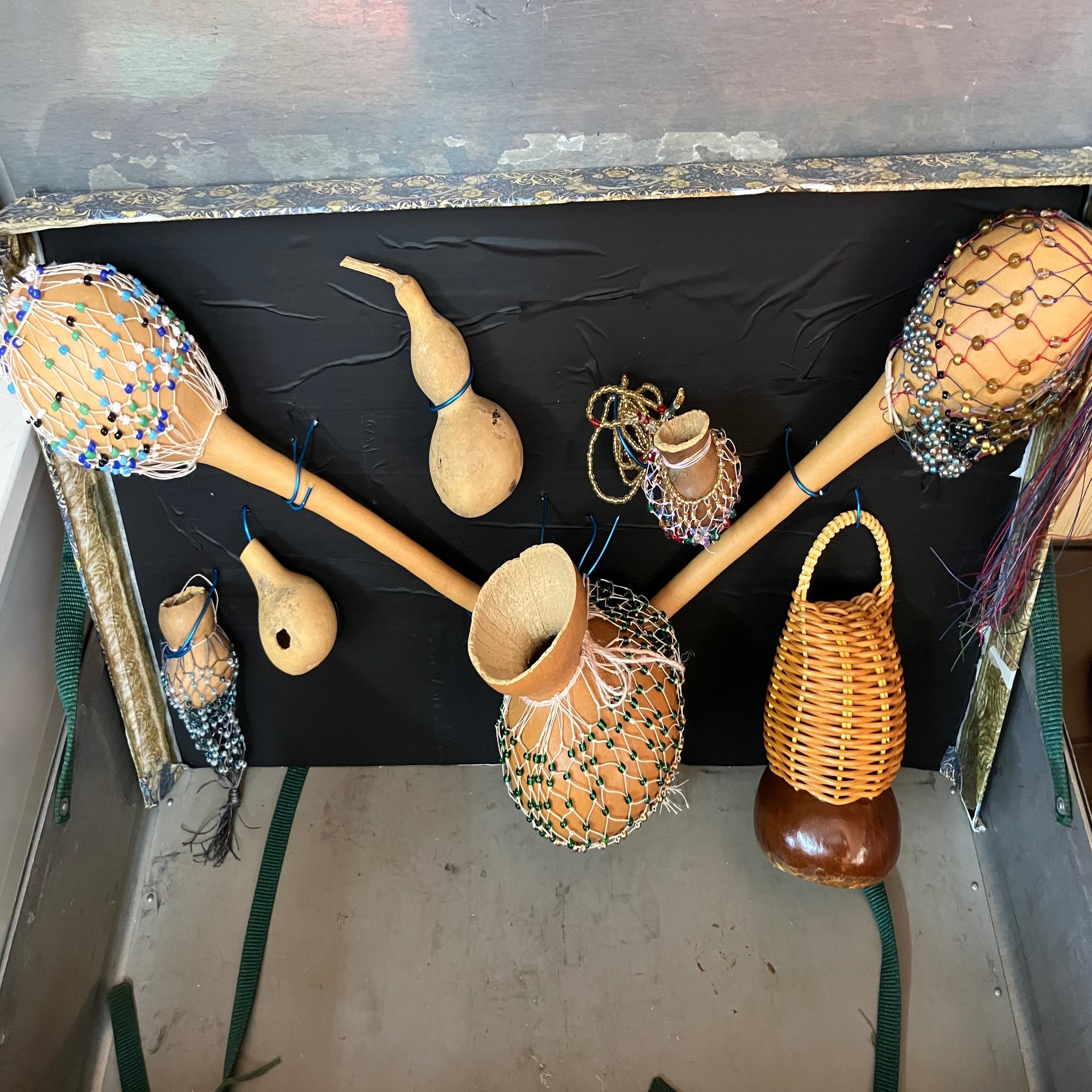 お手がけ用のスチールのトランクに、少しずつおでかけに集まってきたひょうたん楽器たち。