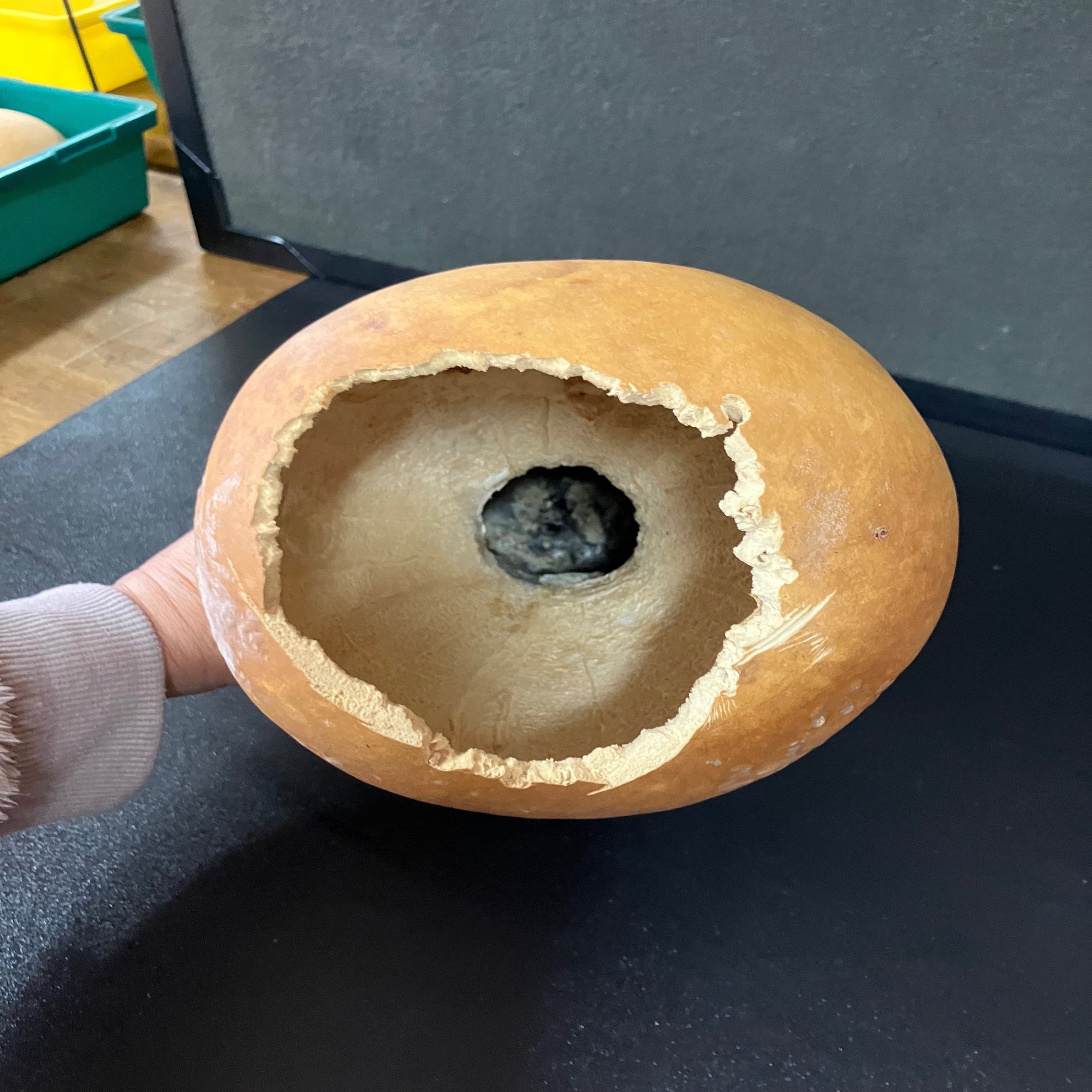 なので、こどもたちは、水筒になるくらいだから、ひょうたんの中身はプラスチックのように、「ツルツル」していると思っているものです。
