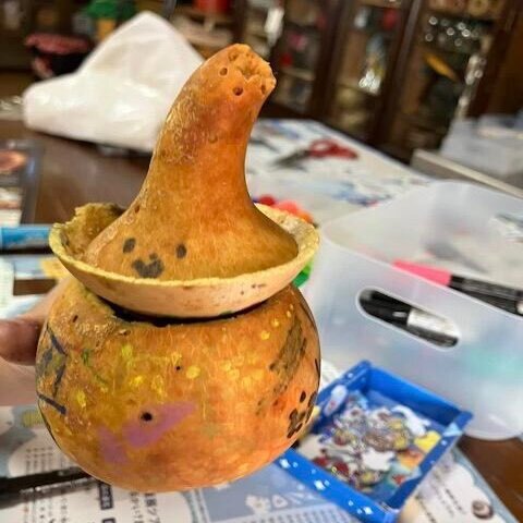 ひょうたんは、おもに義母が栽培していて材料として幼稚園全園児分を賄える量が確保でき、加工もしやすいので、これまでもいろんな工作を幼稚園園児たち、むらさきmusicラボのこどもたちとともにしてきました。